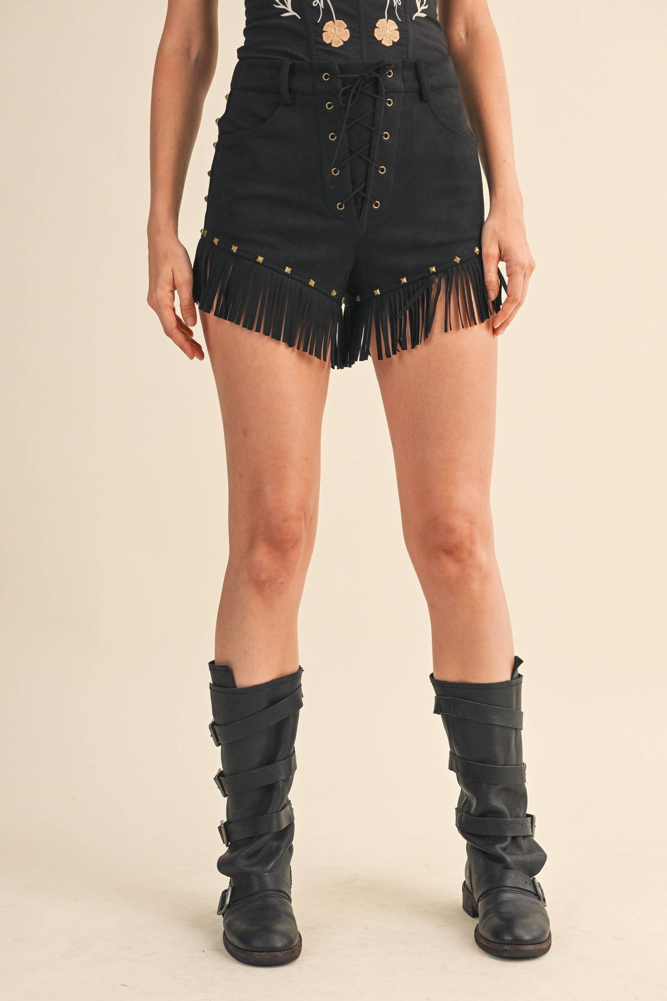 SUEDE FRINGE STUD FRONT LACE UP SHORTS 90% POLYESTER 10% SPANDEX