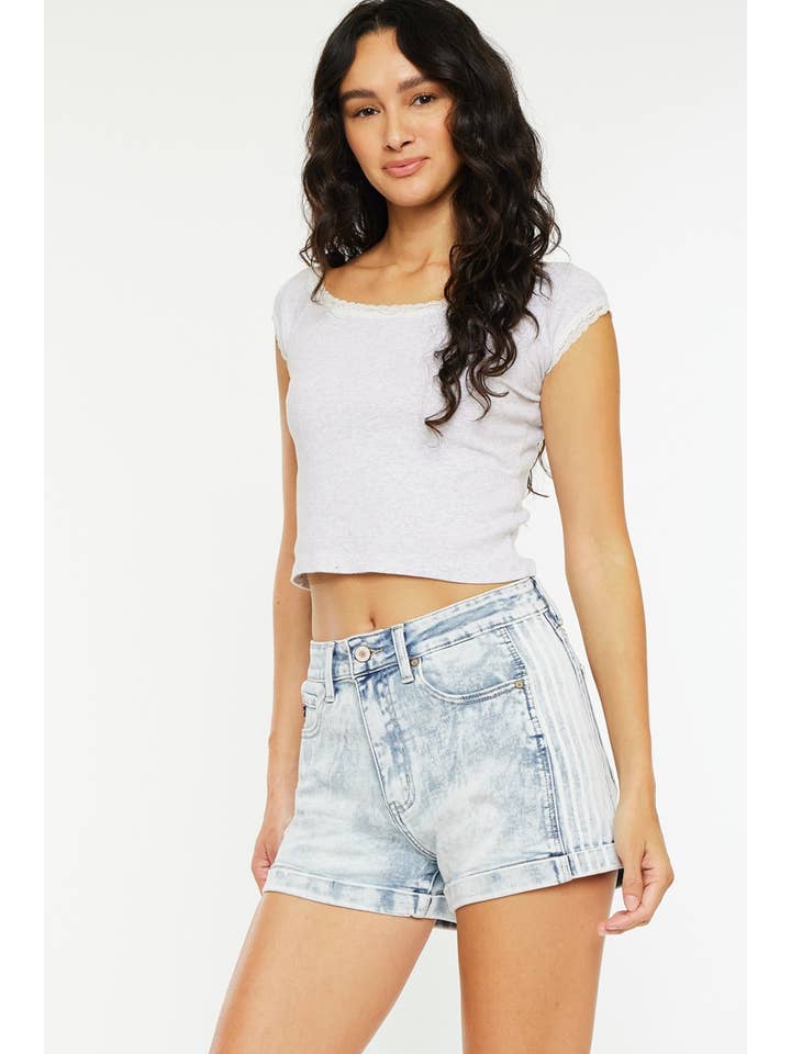 High rise mom denim shorts jeans Light wash Stretch Denim shorts jeans Short jean Side contrast panel Zip fly Rise 11" inseam 3" (w 1” single fold) in size m 82% cotton, 12% rayon, 5% polyester, 1% spandex 13 oz
