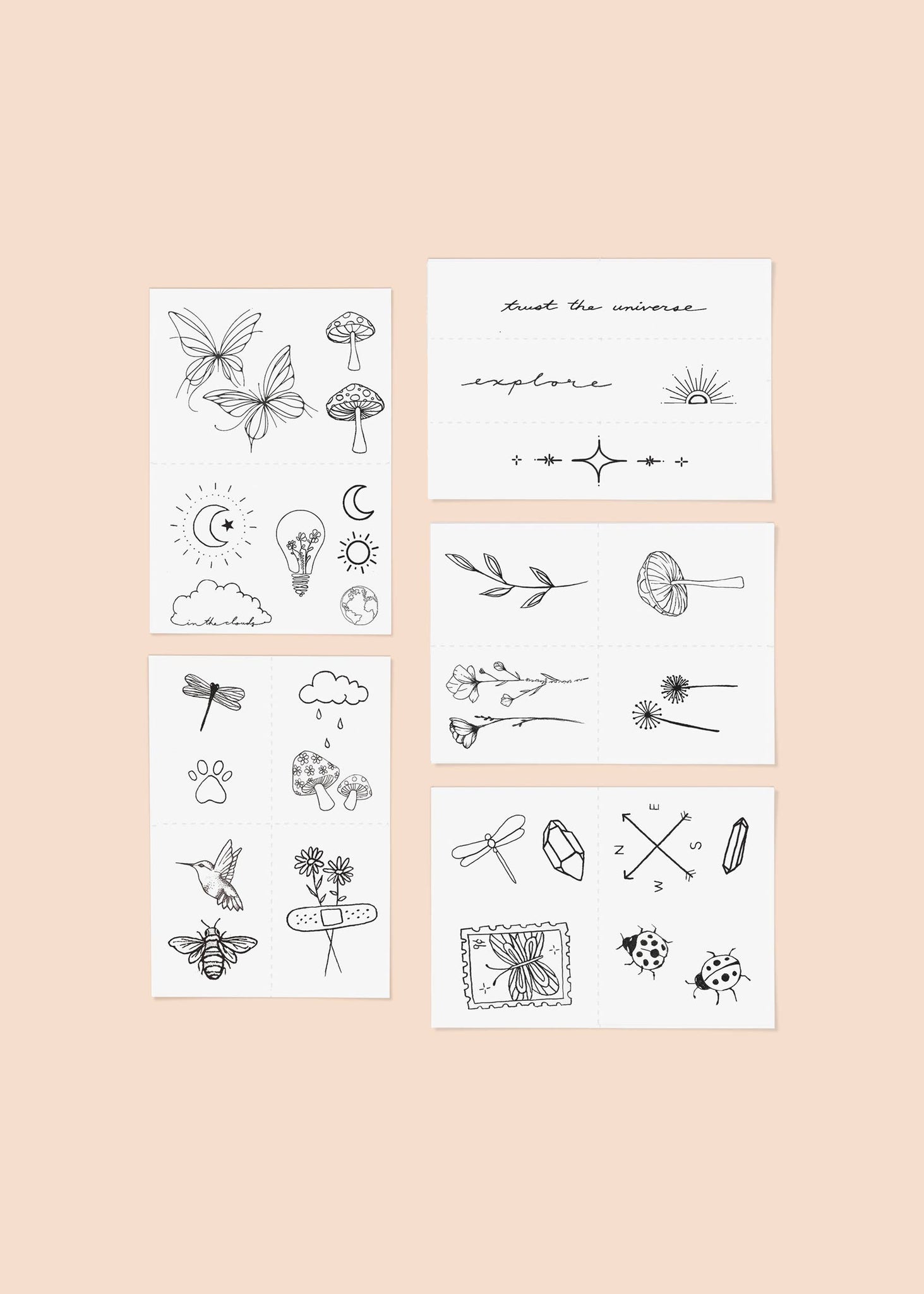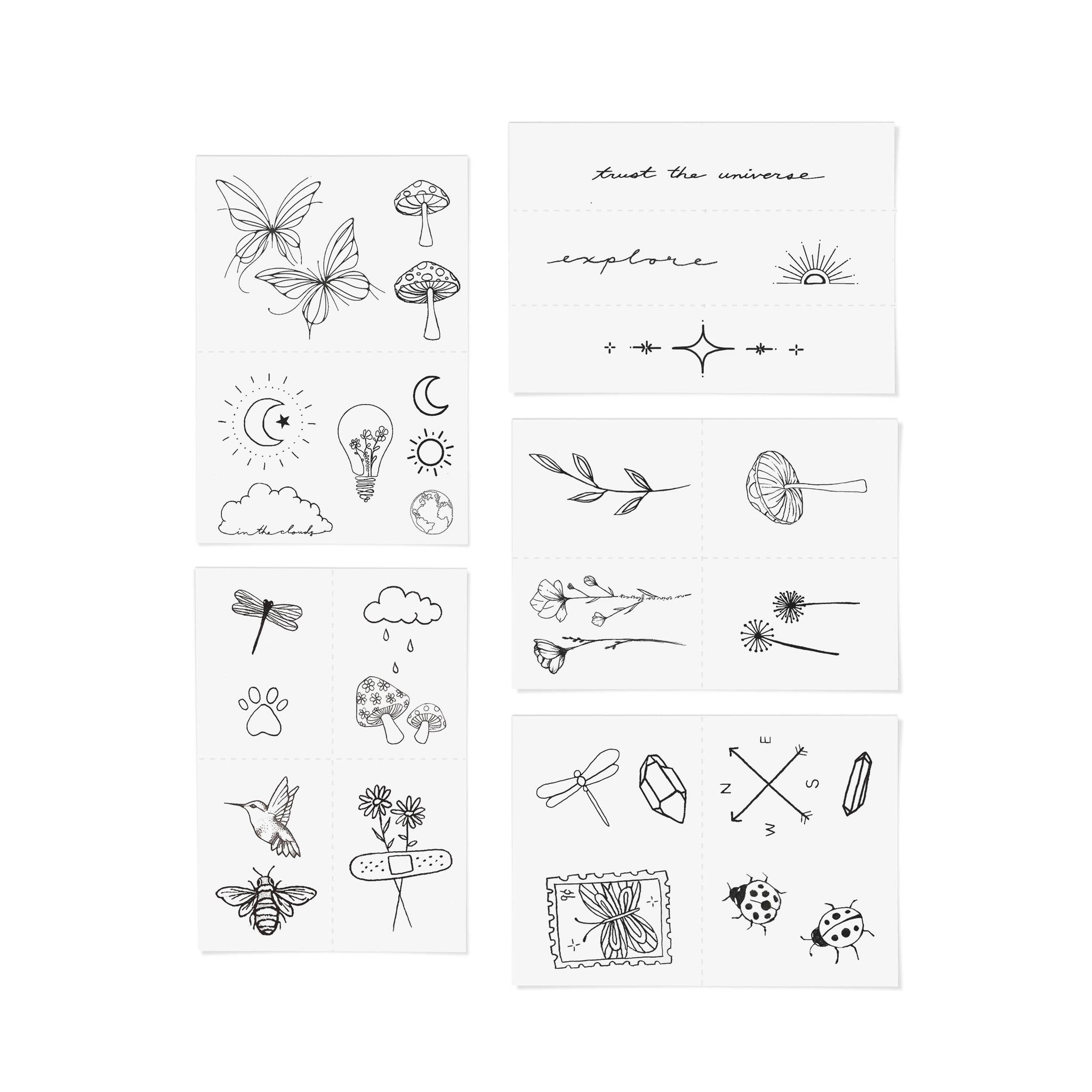 NEW! For your inner wanderer. -EASY TO APPLY WITH JUST WATER -HAND-DRAWN DESIGNS -VEGAN INK -CRUELTY-FREE INK -NON-TOXIC INK -WATERPROOF INK -SIZES RANGE FROM ½ INCH TO 2 INCHES -MADE IN THE U.S.A. -LASTS A FEW DAYS UP TO 2 WEEKS