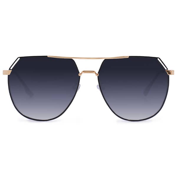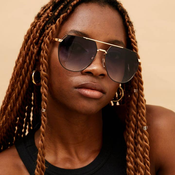 Introducing Farrah. Oversized, retro-inspired aviators inspired by All-American beauty icon, Farrah Fawcett. Channel serious Poster Girl feels with these showstopper frames. • Bold Brow Bar • Delicate gold & black rim • Rounded aviator frame • Contrasting metal temples "I am proud of what I have got and I need an audience”-Farrah Fawcett