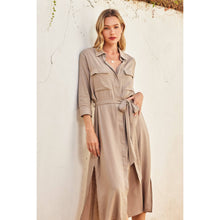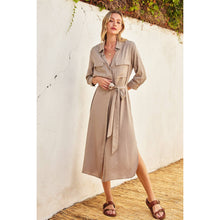 FD12102-CP329_1 Viscose linen blend maxi shirt dress. Model is 5'9" and wearing size Small. - Collared - Shirt dress - Front hidden button closures - Removable sash belt - Front flap pockts - Side slits - Unlined Shell: 70% Viscose, 30% Linen Lining: None