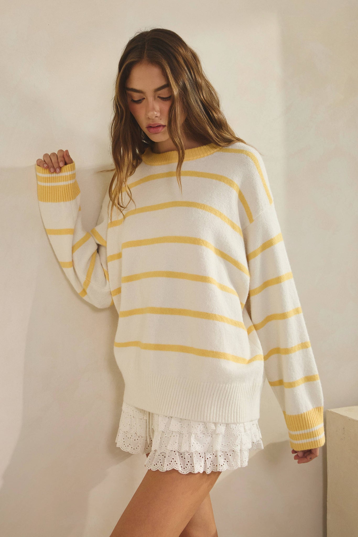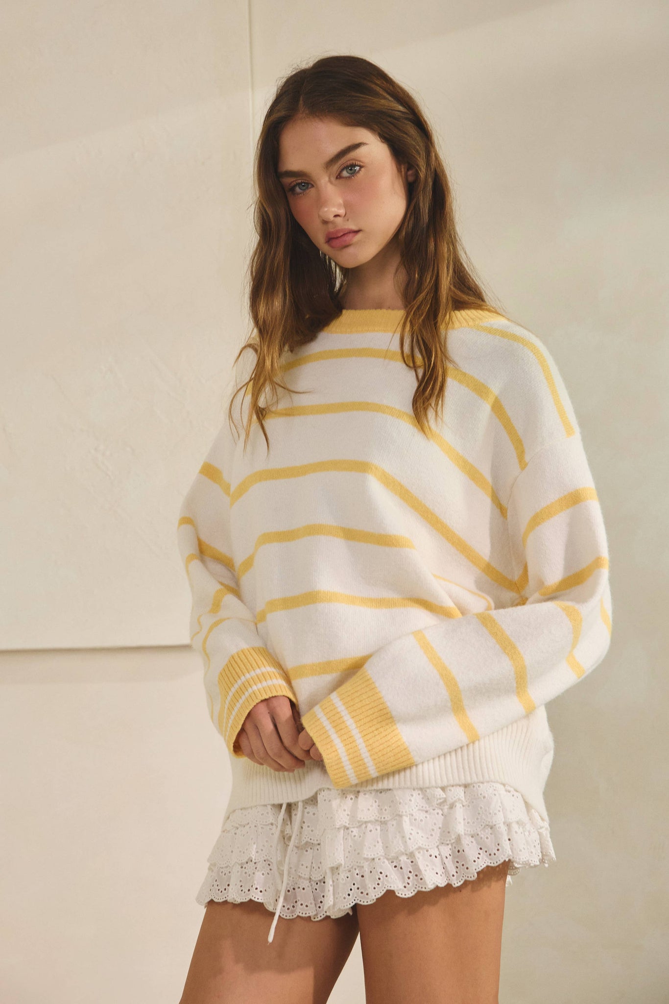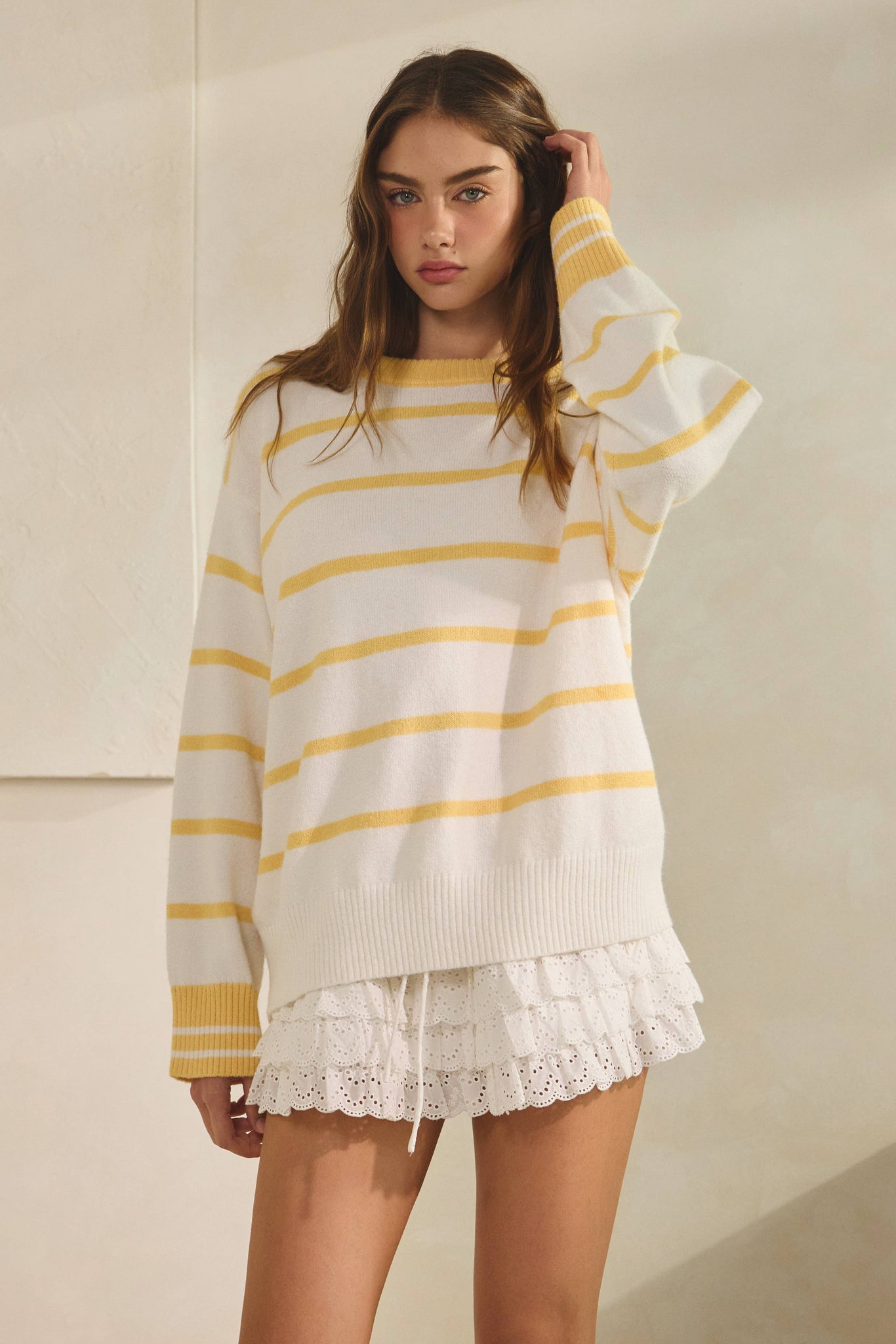Oversized Striped Sweater -Elasticated waist -Crew Neckline -Striped Pattern -Ribbed and Striped Hems -Imported Model\\'s height is 5\\' 10\\" and wearing a size S 82% POLYESTER 15%ACRYLIC 3%SPANDEX