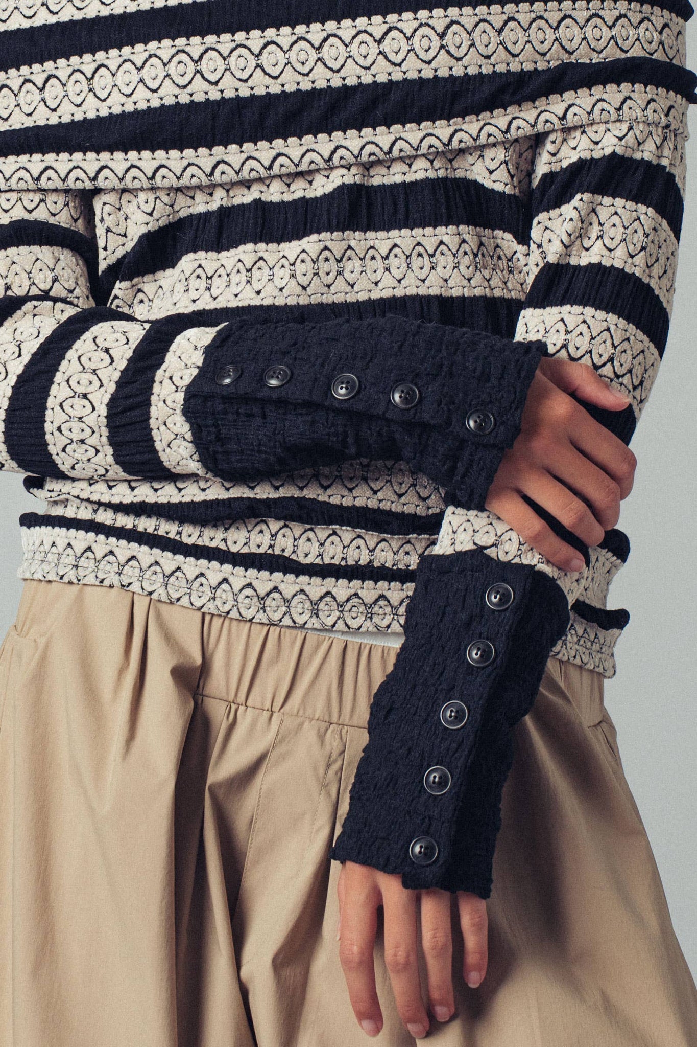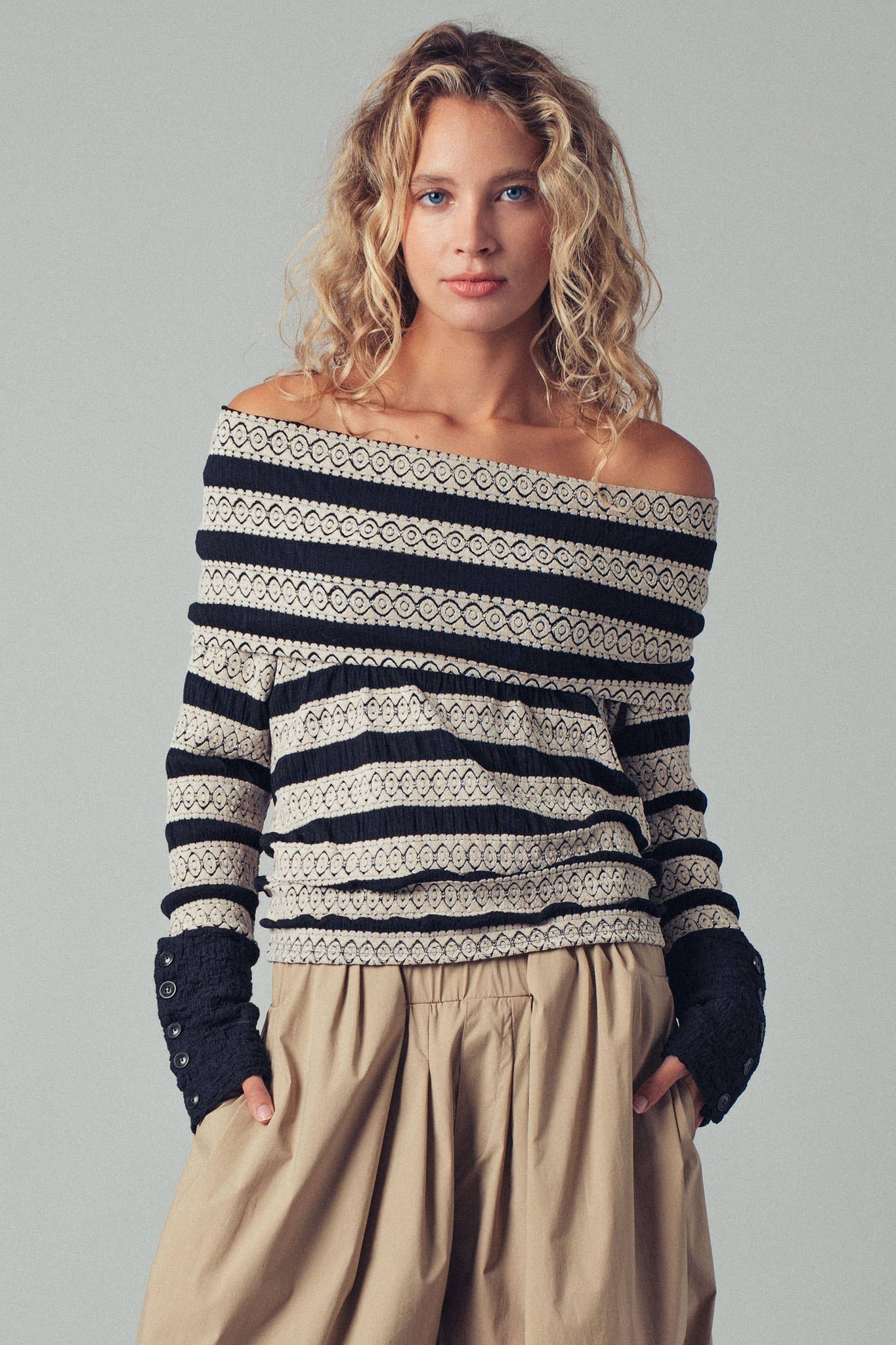 Make a statement in this bold off-the-shoulder knit, featuring chunky black-and-cream stripes with textured detailing. Wide buttoned cuffs add an edgy finish, while the slim, cropped fit flatters the neckline and shoulders for modern elegance. Features: • 62% Polyester, 33% Rayon, 5% Spandex • Off-shoulder silhouette • Wide buttoned cuffs • Textured stripe pattern • Made in China Fit Description: True to size, cropped fit