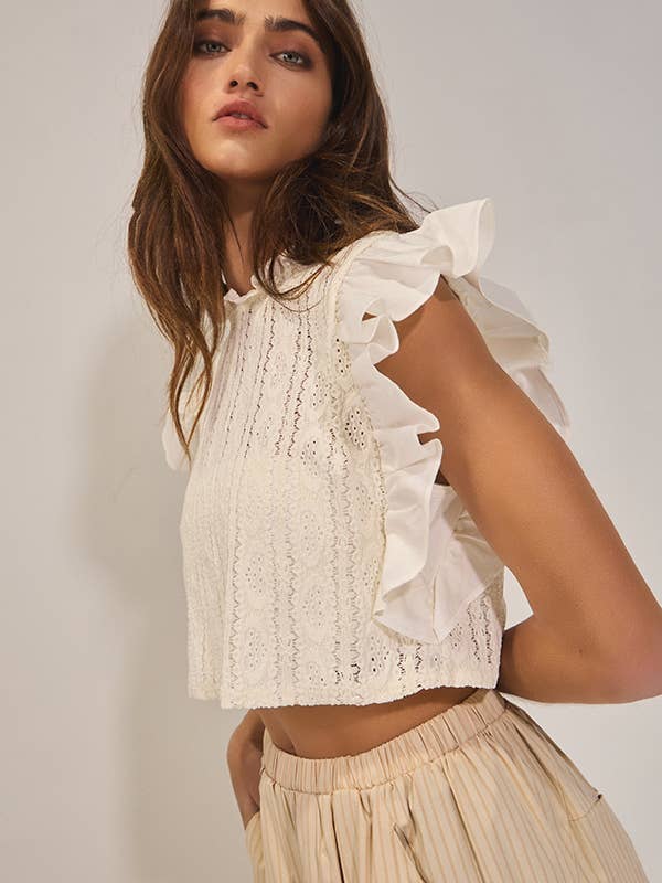 Lace Flounce-Sleeve Crop Top - Lace sheer construction - Flounce cap sleeves - Contrast ruffled round neckline - Back keyhole and button closure - Cropped hem