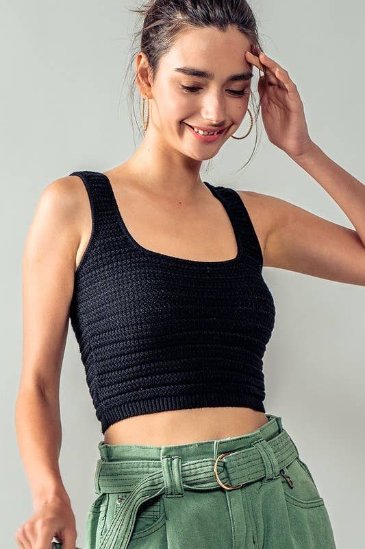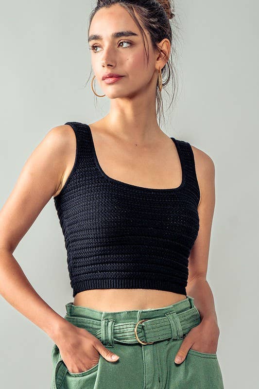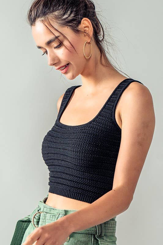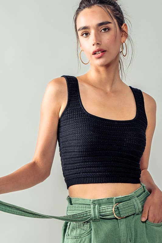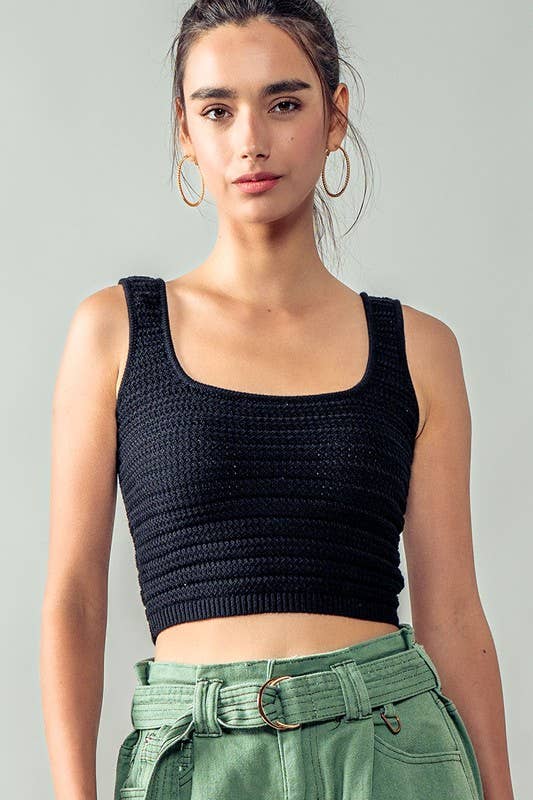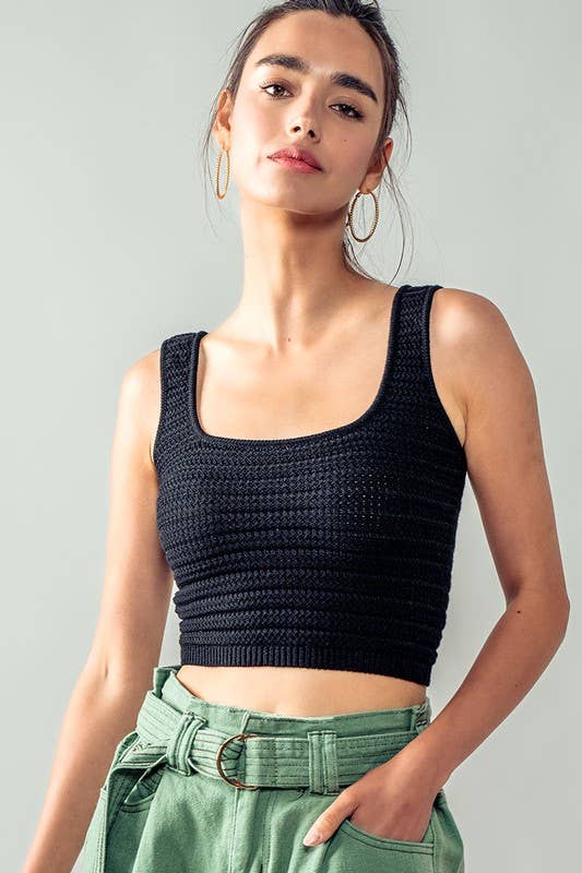 This stylish crochet knit tank top features a modern square neckline and ribbed trim, offering a flattering cropped fit perfect for summer. Lightweight and breathable, it pairs effortlessly with shorts or high-waisted pants for a chic, casual look. Ideal for women's summer tops and trending tank tops. Features: • 100% Polyester • Square neckline, ribbed trim • Cropped length, sleeveless design • Lightweight crochet knit texture • Made in China